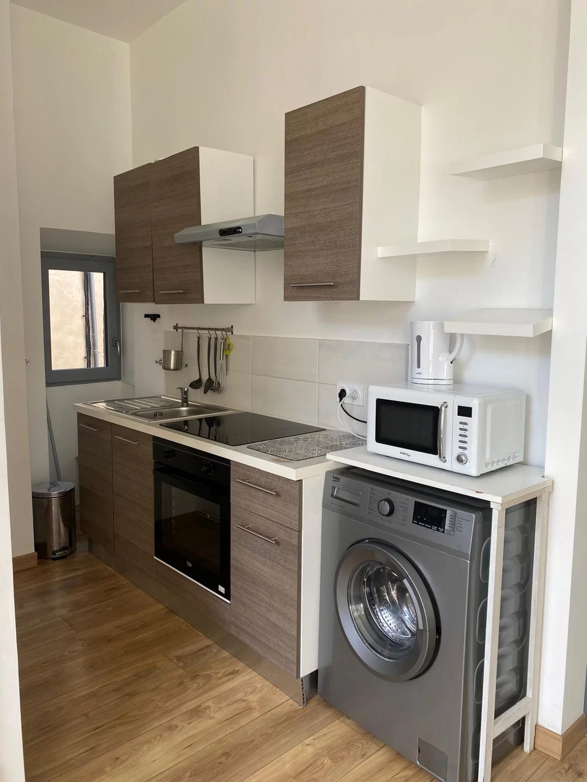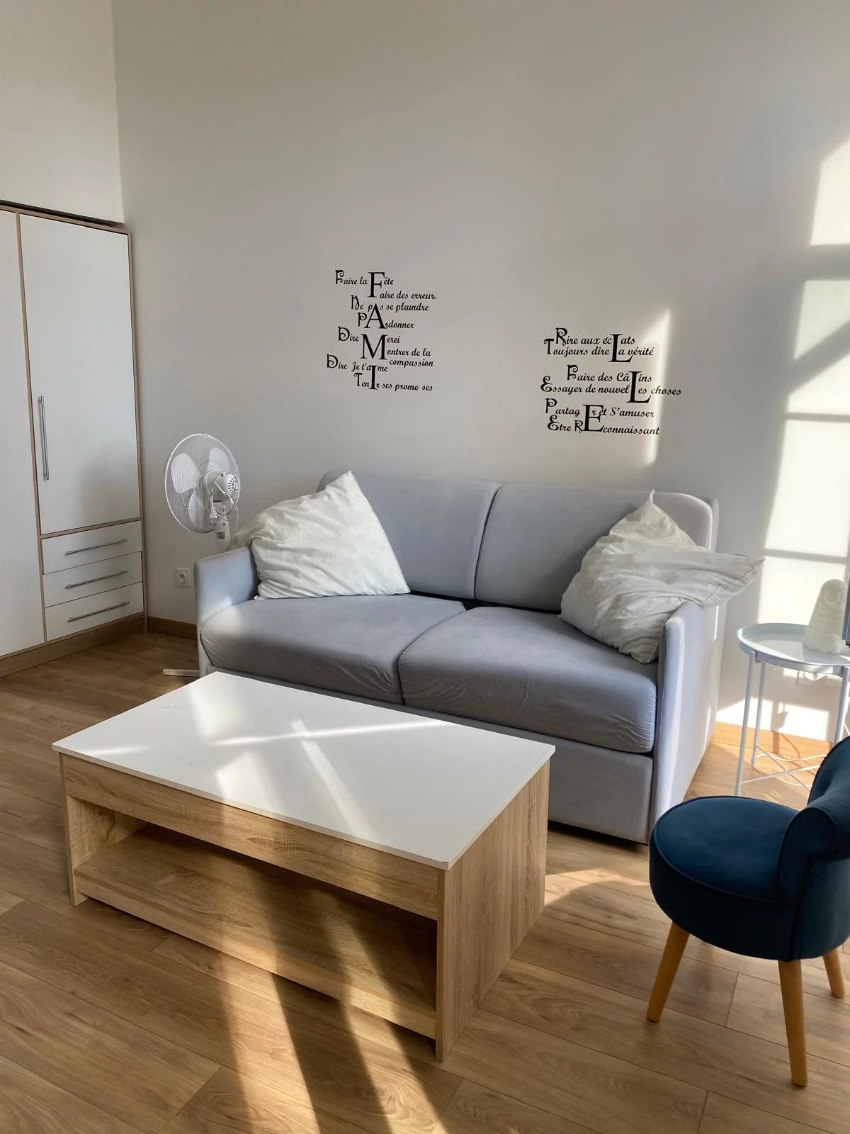 Un canapé- (vrai) lit convertible optimise l’espace, tandis que la cuisine ouverte est entièrement équipée. Une salle d’eau fonctionnelle complète l’ensemble.
